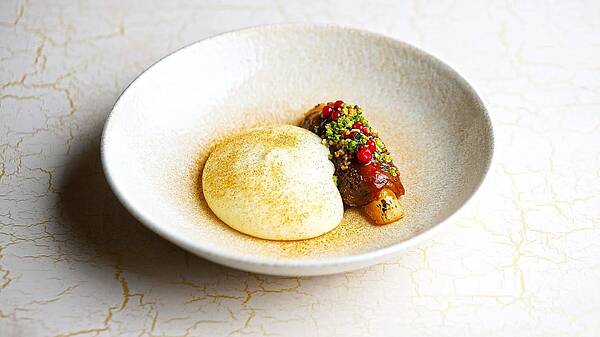 Сварите и разомните картофель вместе со сливочным маслом так, чтобы получилось 800 г пюре. Разбавьте его молоком до консистенции блинного теста, и добавьте мелко натертый сулугуни. Протрите пюре через сито и заправьте смесь в сифон.