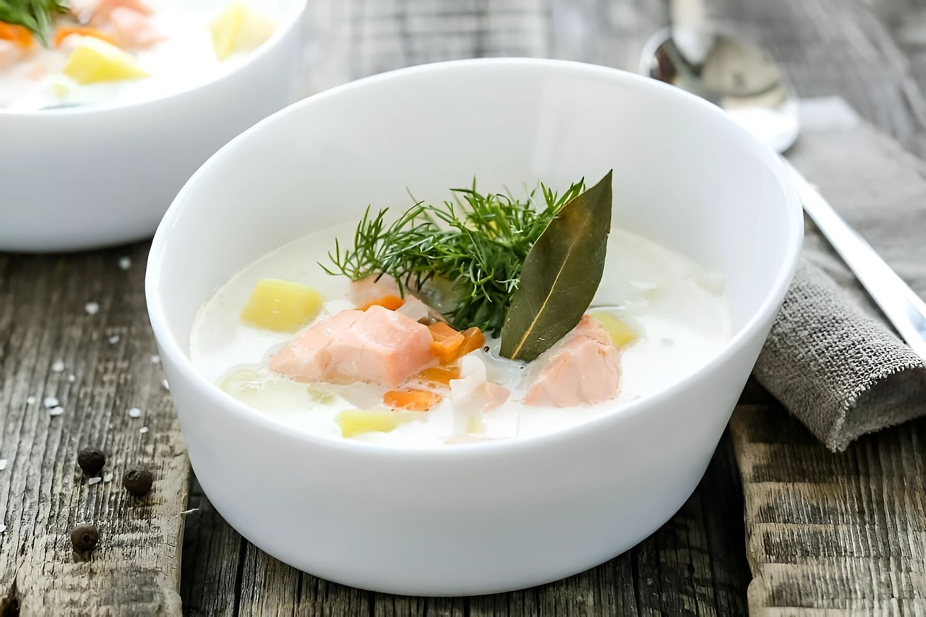 Отдельно пассеруйте на растительном масле морковь и картофель и отправьте в бульон. Варите 30 минут до готовности овощей, затем извлеките брюшко лосося, влейте сливки, пробейте суп блендером и процедите через сито.