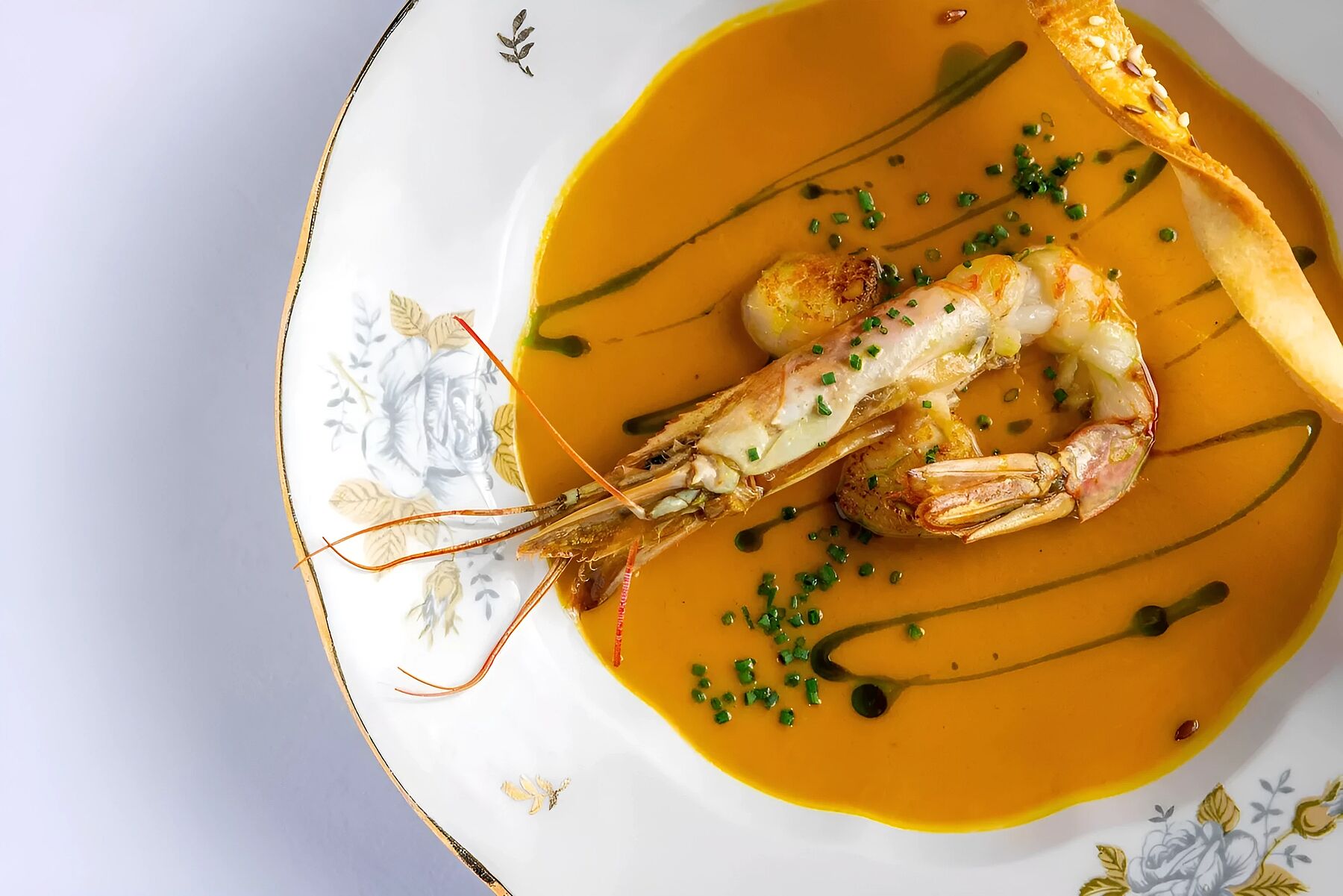 В глубокую тарелку налейте суп, выложите гребешки и аргентинскую креветку. Посыпьте луком сибулет и полейте зеленым маслом.