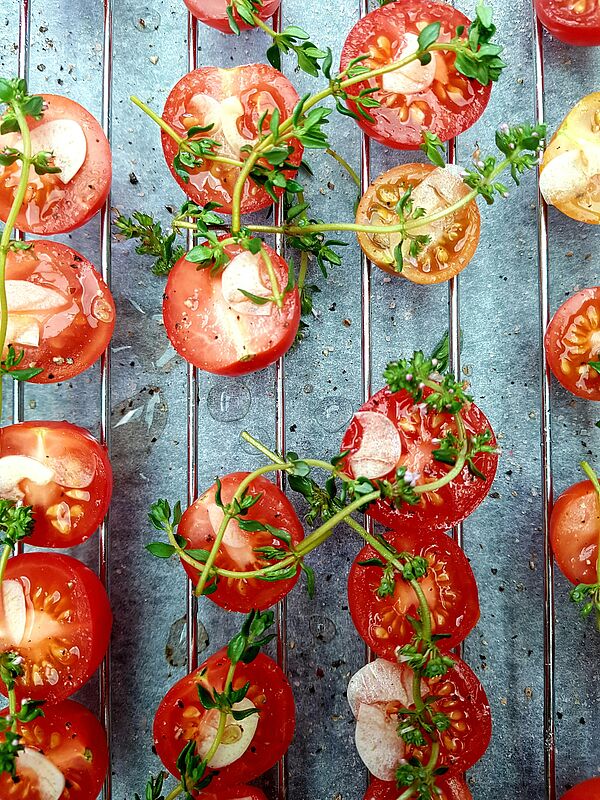 Филе дорадо посолите, поперчите и обжарьте на гриле с двух сторон на оливковом масле до золотистой корочки. Овощи обжарьте на гриле. Рыбу и овощи выложите на тарелку, украсьте листьями мини-шпината, вялеными томатами и маслинами.