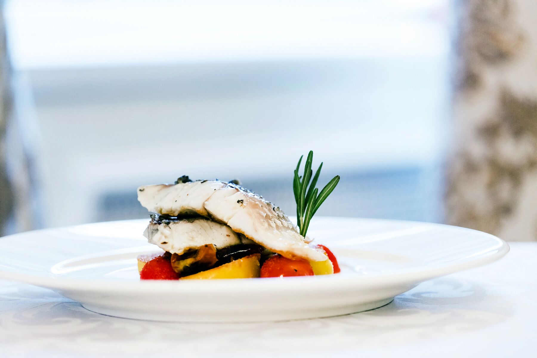 Перед подачей прогрейте мусс из горошка и выложите его на тарелку в виде окружности. В центр выложите обжаренные овощи, сверху — рыбу. Можно украсить блюдо сальсой из маринованных корнишонов, вяленых помидоров, оливкового масла и специй.