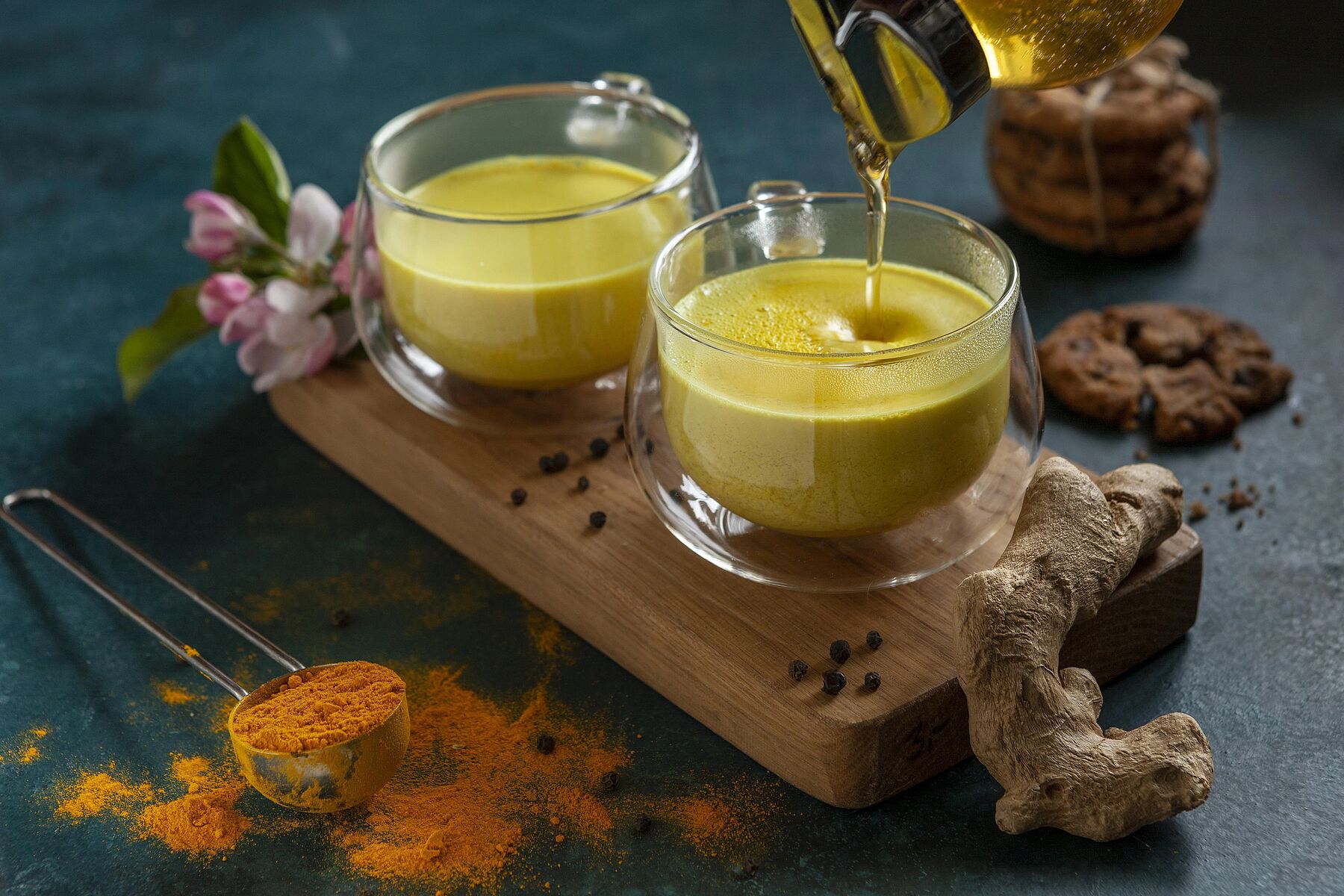 Для того чтобы приготовить этот напиток, вам понадобится мощный блендер: нужно будет измельчить имбирь, а это не всегда просто. Очистите корень, нарежьте некрупными кусками и выложите в блендер вместе с куркумой, кокосовым сахаром, кокосовым маслом и морской солью (четких пропорций не предлагаем, подбирайте по вкусу). Налейте в небольшую кастрюлю миндальное молоко и доведите на среднем огне до кипения. Влейте молоко в блендер и взбейте смесь до однородной пены. Налейте в стакан и украсьте свежемолотым черным перцем.