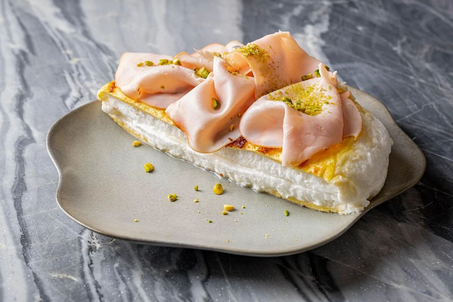 Желтки смешайте с молоком, белки взбейте в густую пену. Разогрейте сковородку, вылейте на нее желтки и уменьшите огонь до минимума. Сверху на желтки выложите белки — толстым слоем, при помощи лопатки. Накройте сковороду крышкой и готовьте на медленном огне, пока белки не схватятся. Переложите омлет на большую тарелку, разрежьте на две части и положите одну часть на другую. Украсьте ветчиной из индейки и мелко нарубленными фисташками.