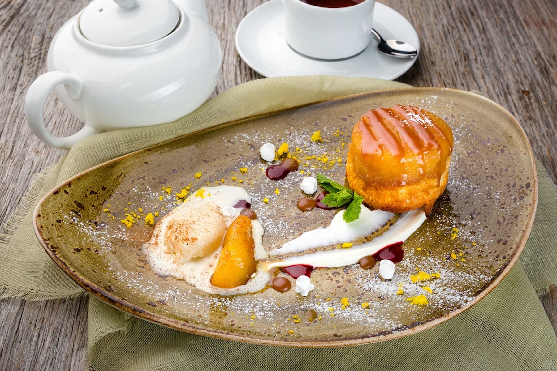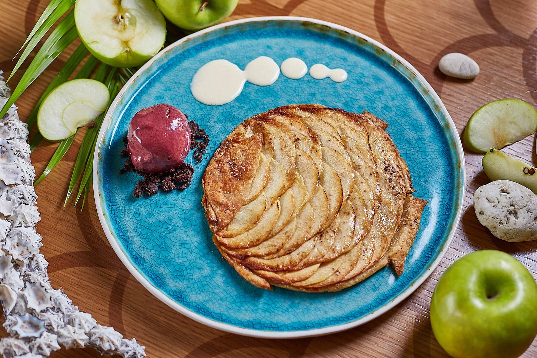 Разогрейте духовку до 170 °С. Раскатайте тесто и выложите его в круглую форму. Очистите яблоки, нарежьте тонкими ломтиками и выложите на тесто внахлест. Смажьте сливочным маслом, посыпьте сахаром и корицей. Выпекайте в течение 40 минут. Тем временем приготовьте соус. Для этого доведите в сотейнике до кипения молоко, добавив к нему сливки и ваниль. Взбейте желтки с сахаром, заварите молочной смесью, перемешайте, процедите и поставьте остывать в холодильник. Горячую кростату посыпьте сахарной пудрой, рядом на тарелку выложите соус. Подавайте с мороженым.