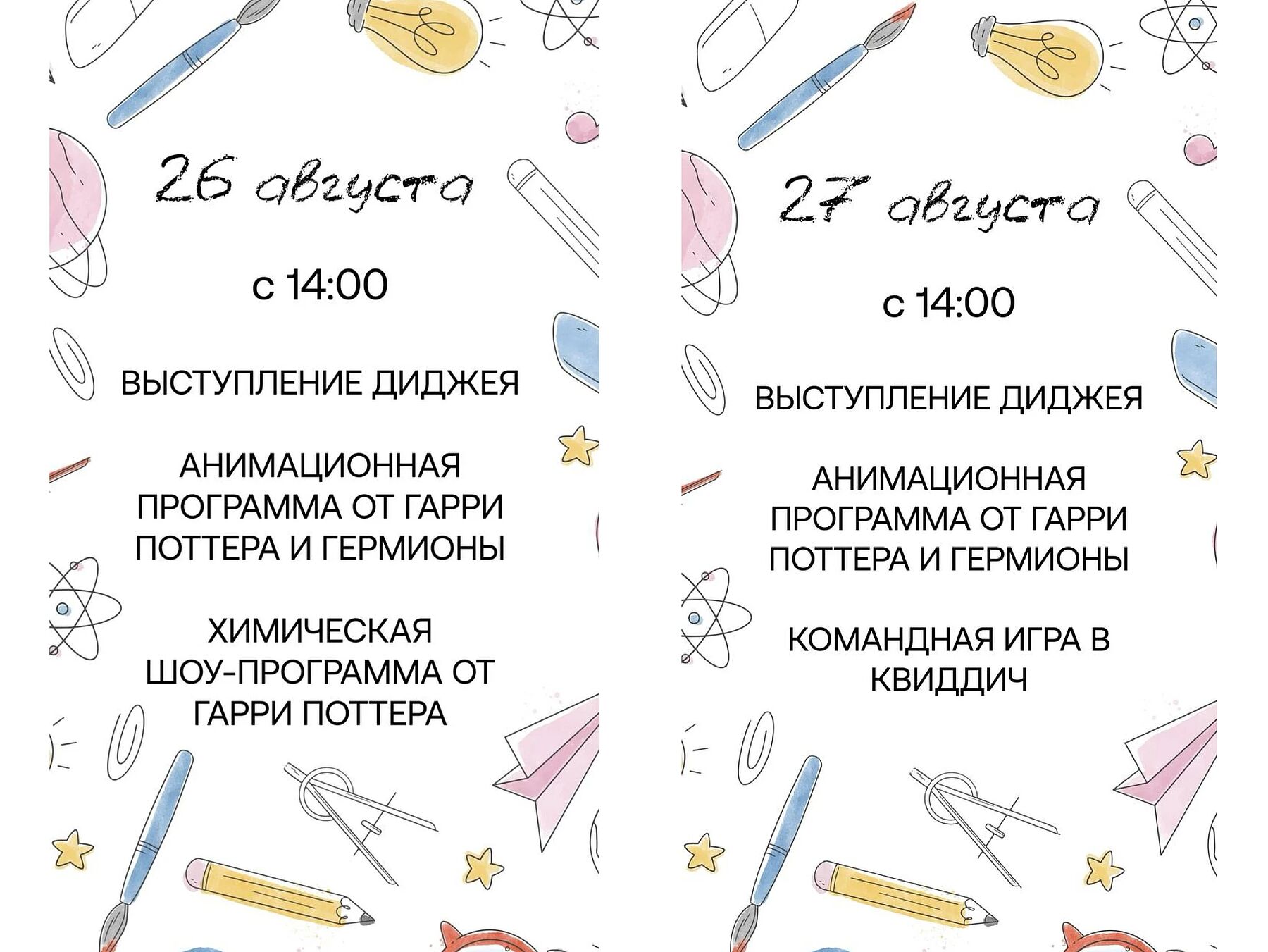 Последний уик-энд перед началом учебного года можно и нужно провести с детьми весело — на шопинге в любимых аутлетах. В Novaya Riga Outlet Village оба дня открыт маркет «Все для школы». Можно выбрать стильную форму, необычную канцелярию, а потом отправиться на мастер-классы. В «Архангельское Аутлет» продолжается проект «Снова в школу», на этих выходных там работает «Школа магии» Гарри Поттера и Гермионы Грейнджер. В субботу они, помимо прочего, проведут химическую шоу-программу, а в воскресенье — командную игру в квиддич. А в «Рига-молле» в субботу детей ждут на мастер-классы, в воскресенье — на традиционный спектакль. Оба дня идут раздача сладостей и обмен книгами.