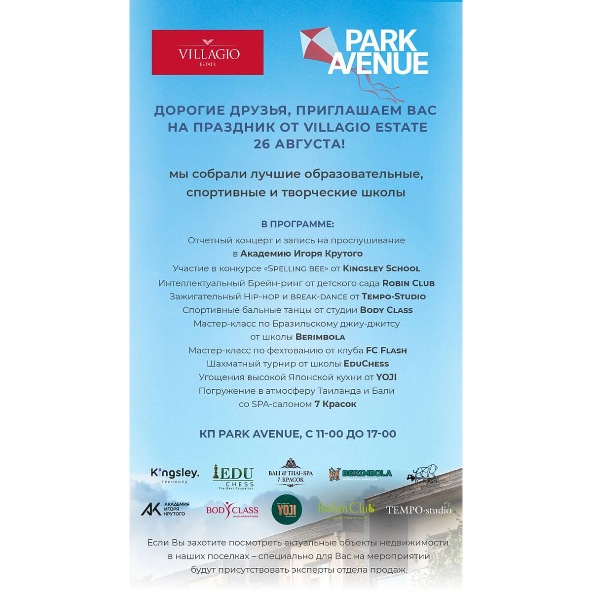 В поселке Park Avenue себя покажут лучшие спортивные и творческие школы — в субботу, на празднике Villagio Estate. Ученики Академии Игоря Крутого, например, дадут отчетный концерт, вдохновившись им, можно будет записаться на прослушивание. Школа Berimbola проведет мастер-класс по бразильскому джиу-джитсу, а клуб FC Flash — по фехтованию. Ну а когда в расписании крошек не останется окон, родители с чувством выполненного долга смогут расслабиться — спа-салон «7 красок» и высокая японская кухня от Yoji by Ида Галич тоже участвуют в нашем празднике.