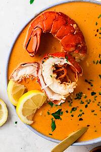 Лук, морковь и стебель сельдерея нарежьте кубиками. На мультиварке выберите режим «Жарка», положите в чашу сливочное масло, растопите его и обжаривайте овощи до мягкости, помешивая, крышку мульиварки не закрывайте. Затем добавьте тимьян, петрушку, лавровый лист, панцирь от лобстера, закройте крышку и тушите на подходящем режиме при температуре 80°С в течение 25 минут. По окончании приготовления откройте крышку, в чашу влейте вино и коньяк. Не закрывая крышку, выберите программу «Жарка» и готовьте еще 15 минут, пока жидкость не станет сиропообразной. Выньте панцирь лобстера и лавровый лист. Влейте бульон и сливки. Когда закипит, выключайте. Перелейте суп из чаши в кувшин блендера и перемешайте до однородной консистенции. Разлейте по тарелкам и добавьте мясо лобстера.