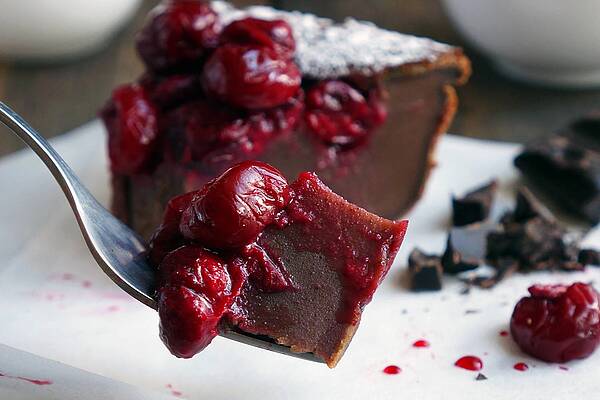 Разогрейте духовку до 200°С. Смажьте форму для выпечки сливочным маслом, размягченным при комнатной температуре. В небольшой миске смешайте муку, какао-порошок и соль. В стационарный блендер добавьте молоко, сахар, яйца и ваниль. Смешайте до однородности, около 20 секунд. Добавьте смесь из муки и какао-порошка, взбивайте, пока все не смешается, около 5–7 пульсаций. Выложите на форму черешню в один слой. Вылейте тесто, сверху выложите кусочки темного шоколада. Выпекайте в духовке, пока края пирога не поднимутся, а тесто в центре не застынет, около 35 минут. Выньте клафути из духовки и дайте остыть около 15 минут. По мере остывания пирог немного осядет. Разложите по сервировочным тарелкам. Подавайте с шариком ванильного мороженого или со взбитыми сливками и шоколадной стружкой.