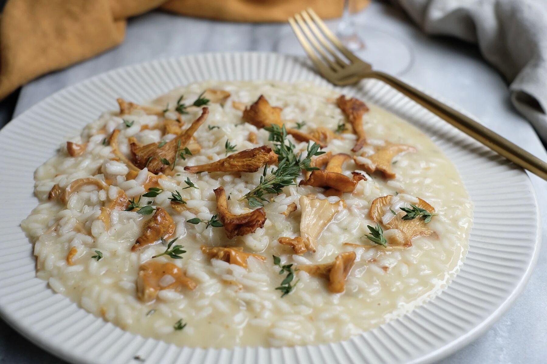 Очистите лисички от грязи и обжарьте на сухой сковороде. Слейте лишнюю жидкость в стакан, налейте на сковороду оливковое масло, посолите и поперчите грибы и готовьте еще 5 минут. Измельчите грибы ножом, оставив часть для украшения. Мелко нарежьте лук. Хорошо разогрейте овощной бульон — он должен быть горячим. Снимите листья с веточек тимьяна. В сотейнике растопите 25 г сливочного масла, добавив к нему оливковое. На медленном огне тушите лук до мягкости, затем выложите к нему сухой рис и обжаривайте несколько минут, пока рис не станет прозрачным. Увеличьте огонь и когда сотейник разогреется, влейте вино — оно должно зашипеть. Выпарите вино, немного убавить огонь. Затем влейте черпак смеси овощного и грибного бульонов, помешивая рис. Когда жидкость впитается в рис, влейте новую порцию, помешивая ризотто (не редко, но и не все время). Повторяйте эти действия по мере исчезновения жидкости в сотейнике. Через 12 минут добавьте измельченные лисички и листья тимьяна и тушите еще 3 минуты. Затем выключите огонь. Натрите сыр грана падано, взбейте вилкой с размягченным сливочным маслом, белым перцем, лимонной цедрой и вмешайте в ризотто. Украсьте его жареными лисичками и рубленой петрушкой.