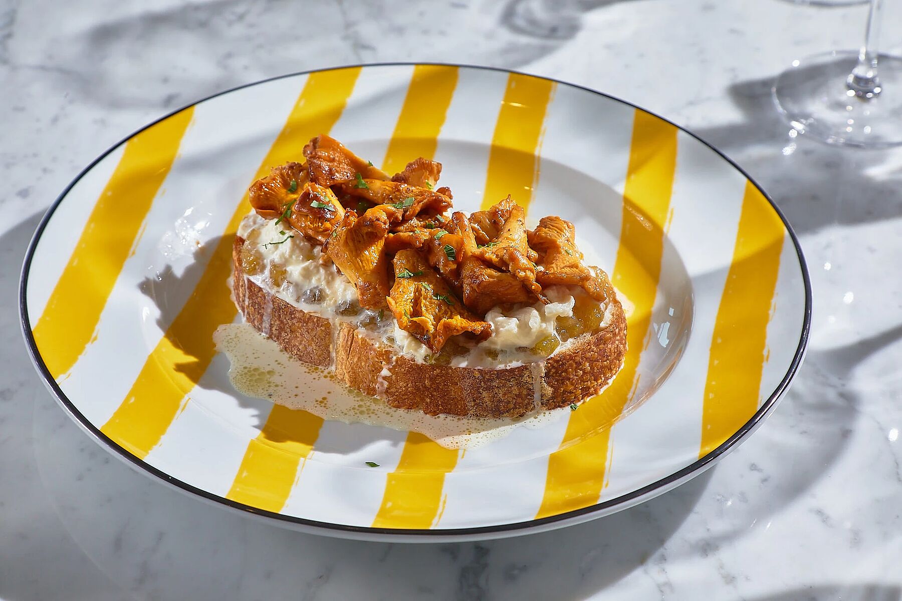 Для приготовления варенья очистите ревень и яблоки, нарежьте их произвольным образом. Сложите в кастрюлю, засыпьте сахаром и залейте водой. На медленном огне доведите до кипения и варите 7–10 минут. Подсушите хлеб в тостере или на сковородке. На небольшом огне поджарьте лисички, помешивая, в течение 1–2 минут. Выложите на хлеб варенье, затем страчателлу и лисички.