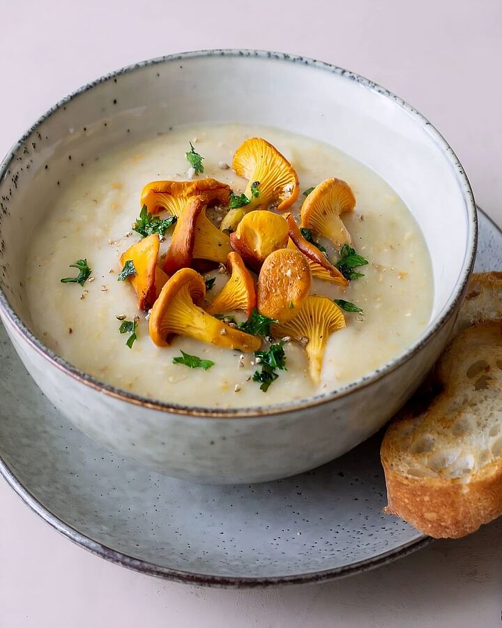 Мелко нарежьте лук, картофель — кубиками, брокколи разберите на соцветия. Пассеруйте лук. Картофель и брокколи отварите до полуготовности и процедите, оставив 250 мл бульона. Очистите лисички и обжарьте их на растительном масле с солью и перцем. Половину выложите на бумажную салфетку, оставшуюся часть измельчите в блендере с луком, картофелем, брокколи и чесноком, постепенно вливая бульон и сливки. Проварите крем-суп 2–3 минуты, добавив специи и жареные лисички. Разлейте по тарелкам, украсьте листьями мяты.