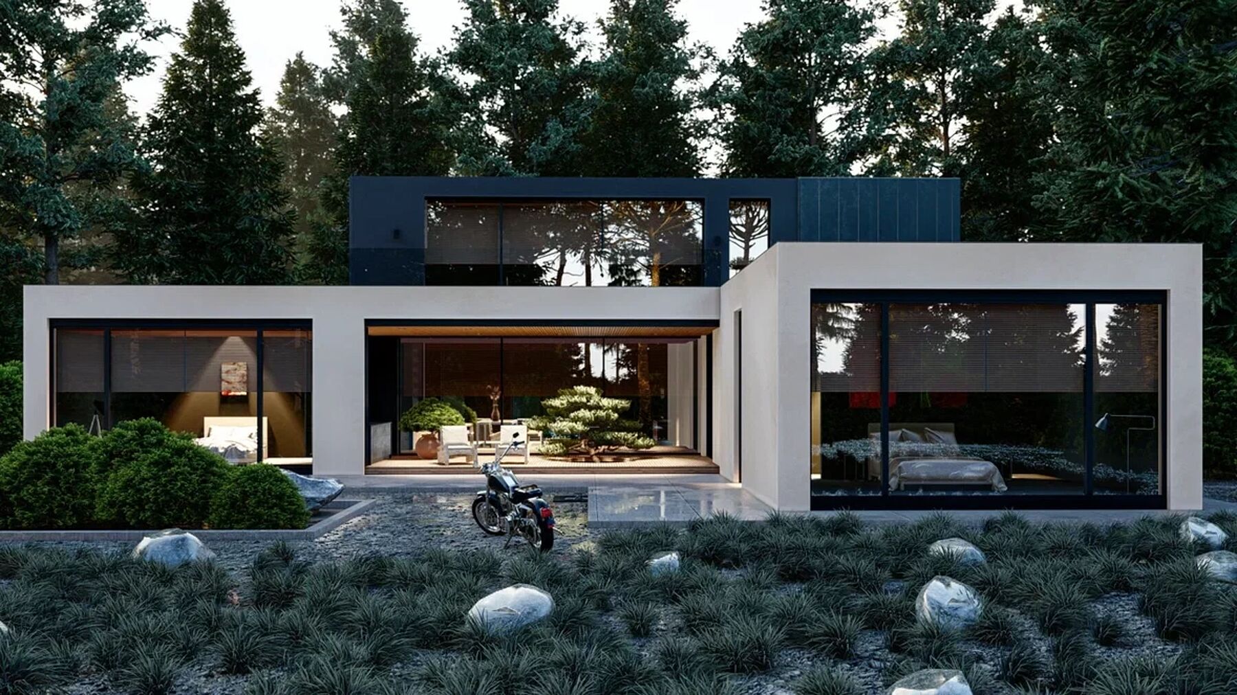 Дом выполнен в современном стиле с плоской крышей и панорамной крышей.