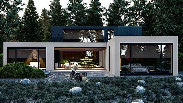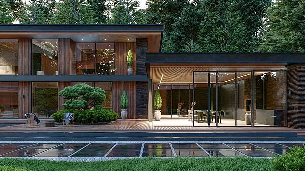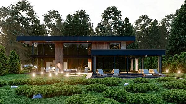 Дом выполнен в современном стиле с плоской крышей и панорамной крышей.