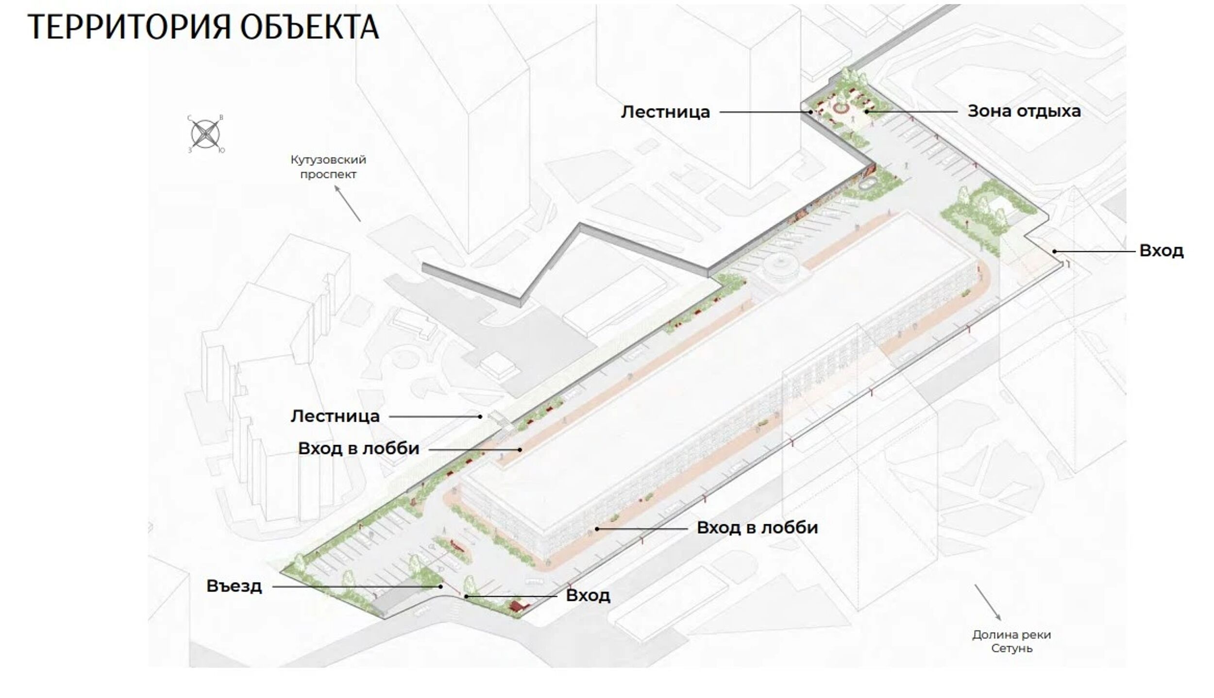 Для сотрудников и посетителей работает кафе-столовая и собственная галерея из 50 ретейловых пространств. Вокруг здания собственная благоустроенная территория с уединённой зоной отдыха. В пешей доступности самый большой в Москве природный заказник «Долина реки Сетунь» площадью 696 га. Здесь сотрудникам удобно отдохнуть после работы, совместить пикник с сессией по генерации идей, провести неформальную встречу или тимбилдинг. Рядом с деловым центром расположены премиальный фитнес-клуб с бассейном, кафе, магазины и салоны красоты.