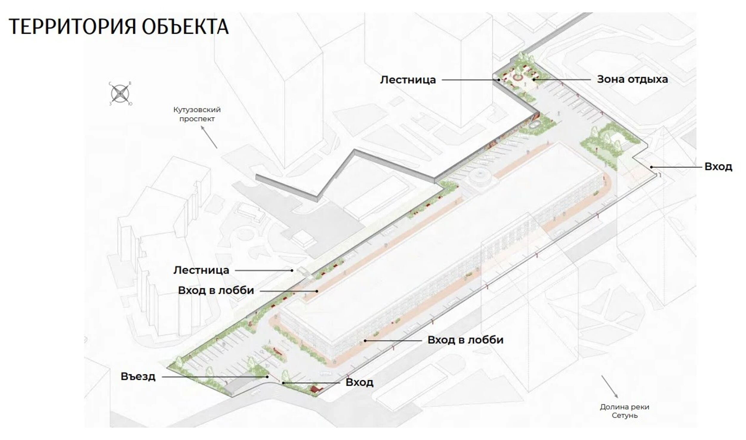 К деловому центру удобно подойти с трёх сторон, поэтому рядом всегда много посетителей. На своей благоустроенной территории приятно отдохнуть и погулять в красивом окружении. В пешей доступности самый большой в Москве природный заказник «Долина реки Сетунь» площадью 696 га.