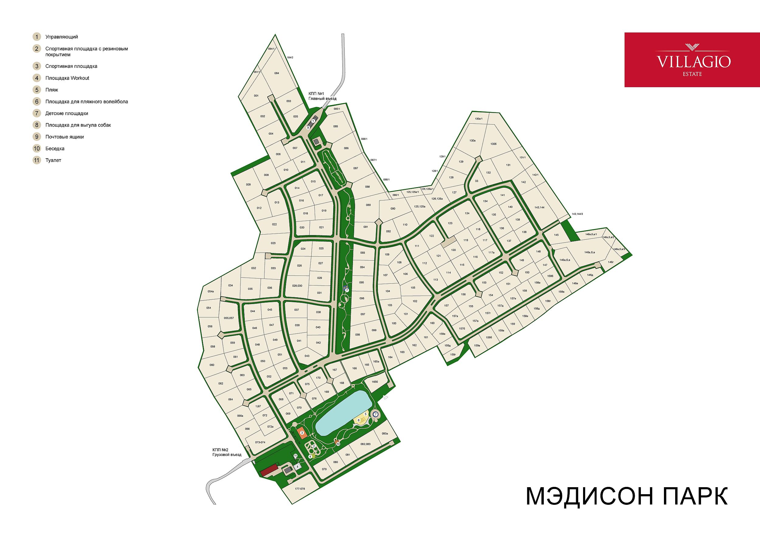 Madison Park — камерный премиальный поселок Villagio Estate, расположенный в хвойном лесу рядом с «Гринфилдом». Проект реализован в 2011–2014 гг. Площадь поселка — 69 га, 212 домовладений, что обеспечивает приватность и уют.