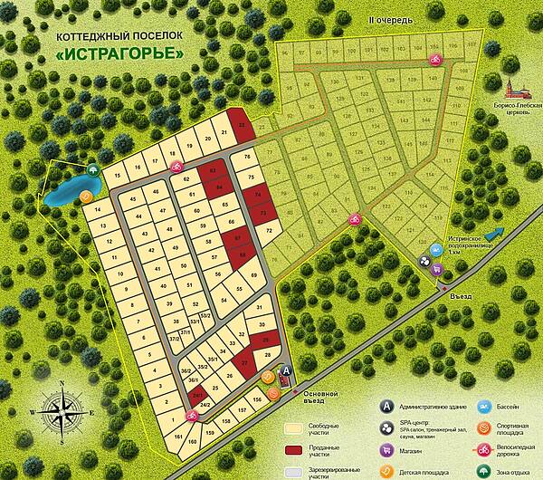 Поселок занимает более 50 гектаров и включает около 380 домовладений, окруженных живописными лесами и историческими дачами. Атмосфера уединения и комфорта подчеркивается хорошо продуманной инфраструктурой. Здесь предусмотрены: